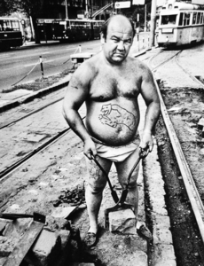 1992This tough man was hanging in a tree on the Leidse square in Amsterdam, he was a kind of street artist / performer. And he probably needed the attention he was getting!