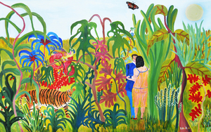 2022This painting is inspired by an image of Adam & Eve, I depicted them in my own way in a kind of fantasy garden with various flora and fauna. The birds are existing birds!