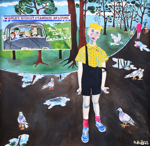 2025This painting is derived from 2 photos, the boy with the toy handgrenade comes from a photo of the New York photographer Diane Arbus. The billboard in the background comes from a photo made by the American photographer Margaret Bourke-White. I gave the boy a "Trumpian" haircut, it has become a kind of visual commentary on the current political "climate" in the USA and the rest of the world!